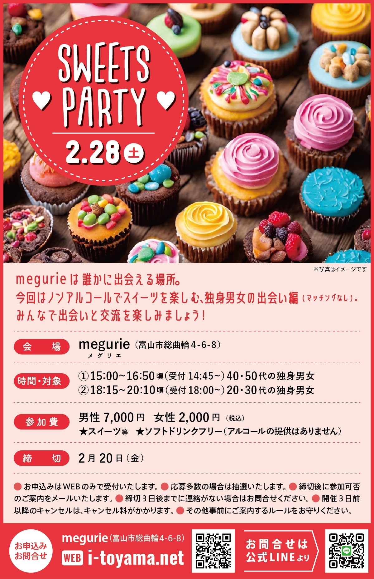 - 2026年2月28日(土) 1部 男性 10:00~12:00(受付9:40~) 女性(式場・ドレス見学希望者) 10:25~12:00(受付10:05~)、女性(出逢いイベントのみ)11:00~12:00(受付10:40~) 2部 男性 13:30~15:30(受付13:10~) 女性(式場・ドレス見学希望者) 13:55~15:30(受付13:35~)、女性(出逢いイベントのみ)14:30~15:30(受付14:10~)