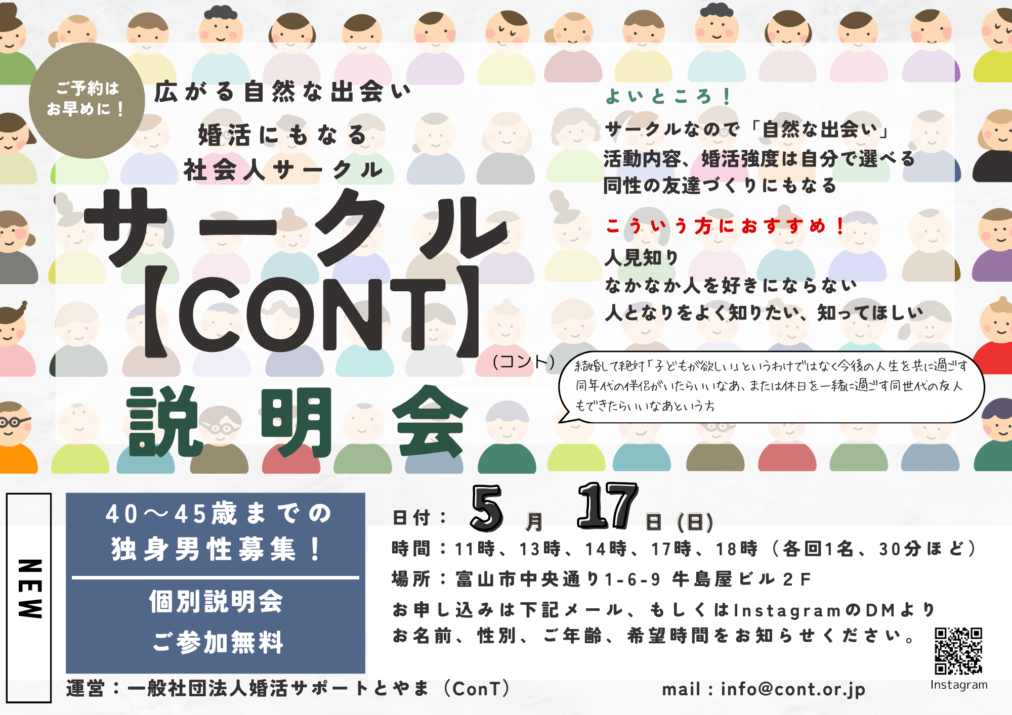 40~45歳までの独身男性限定!婚活に、趣味作り友達作りにいかかですか? 【サークルConT】説明会!